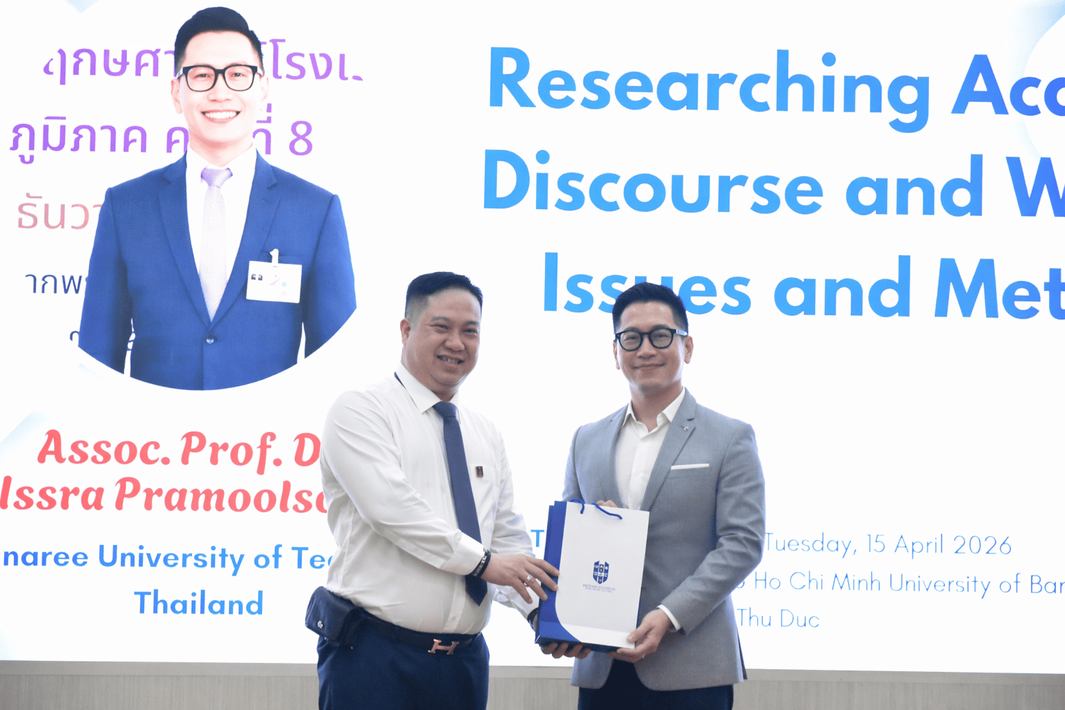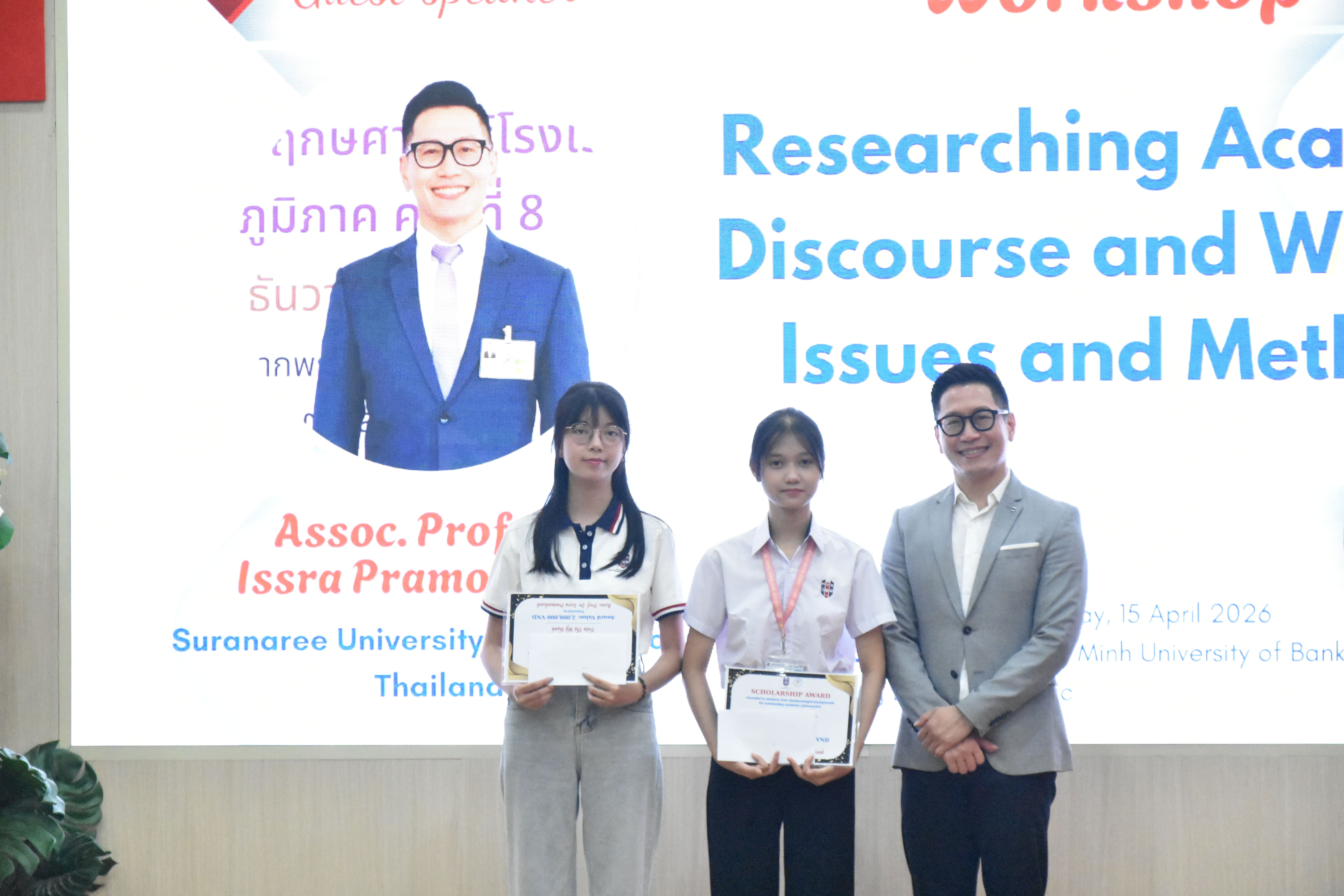 Trong khuôn khổ chương trình, các hoạt động giao lưu học thuật diễn ra trang trọng và ý nghĩa, bao gồm nghi thức trao quà lưu niệm giữa Nhà trường và diễn giả, cũng như việc PGS.TS. Issra Pramoolsook trao học bổng khuyến học cho hai sinh viên có hoàn cảnh khó khăn, thể hiện tinh thần hợp tác và trách nhiệm xã hội.